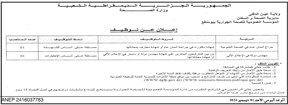 اعلان توظيف بالمؤسسة العمومية للصحة الجوارية ببومدفع عين الدفلى
