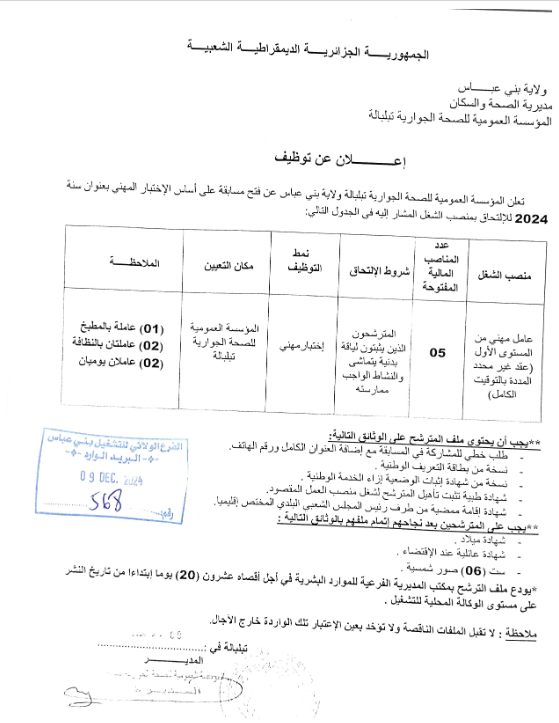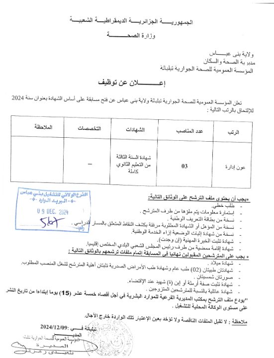 تعلن المؤسسة العمومية للصحة الجوارية تبلبالة ولاية بني عباس عن فتح مسابقة توظيف على أساس الشهادة بعنوان سنة 2024
