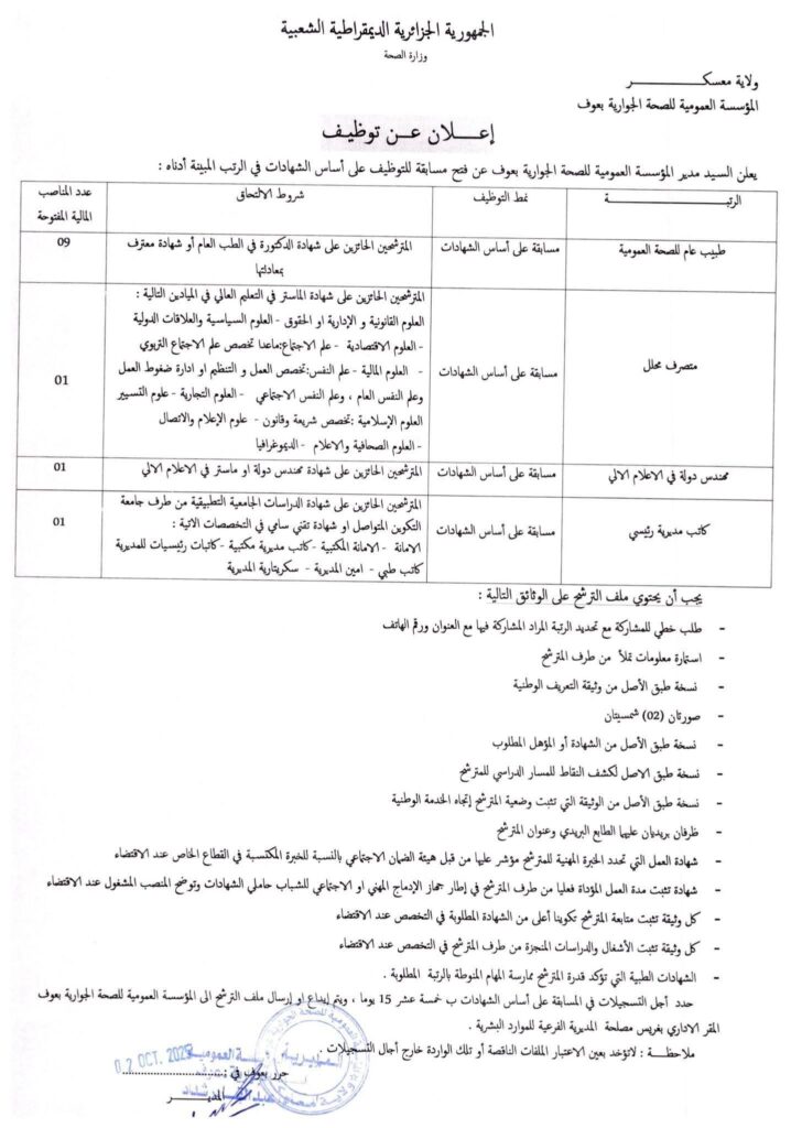 اعلان توظيف بالمؤسسة العمومية للصحة الجوارية بعوف معسكر