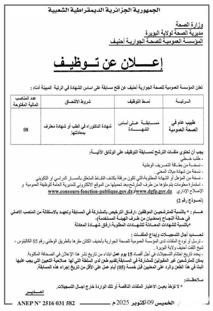 اعلان توظيف بالمؤسسة العمومية للصحة الجوارية بأحنيف البويرة