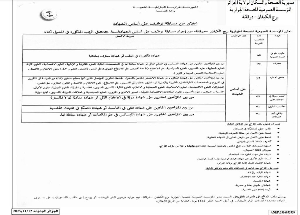 تعلن المؤسسة العمومية للصحة الجوارية برج الكيفان – درقانة عن تنظيم مسابقة توظيف على أساس الشهادة بعنوان سنة 2025، في الرتب المبينة في الجدول أدناه: