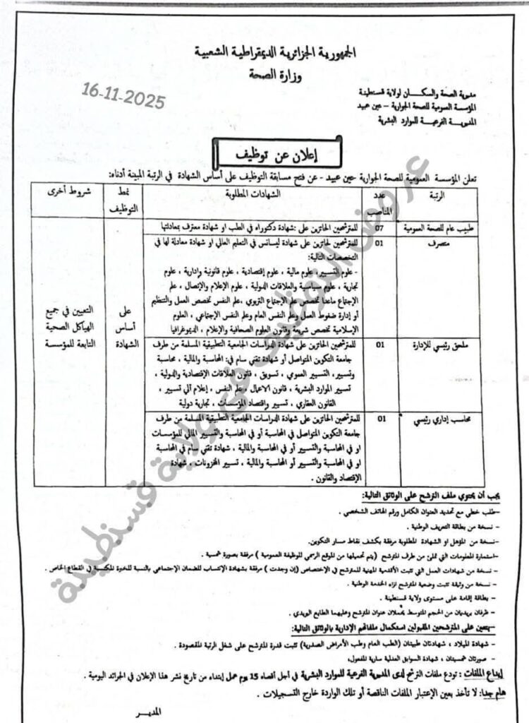اعلان توظيف بالمؤسسة العمومية للصحة الجوارية بعين عبيد قسنطينة