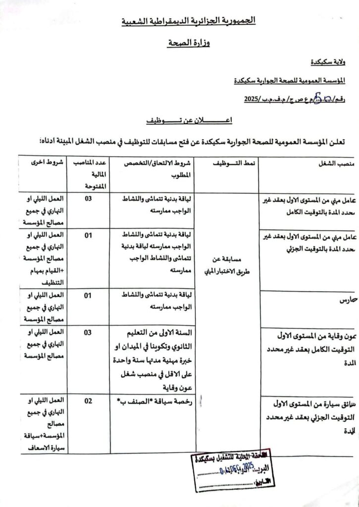 تعلن المؤسسة العمومية للصحة الجوارية سكيكدة عن فتح مسابقات للتوظيف في منصب الشغل المبينة أدناه: