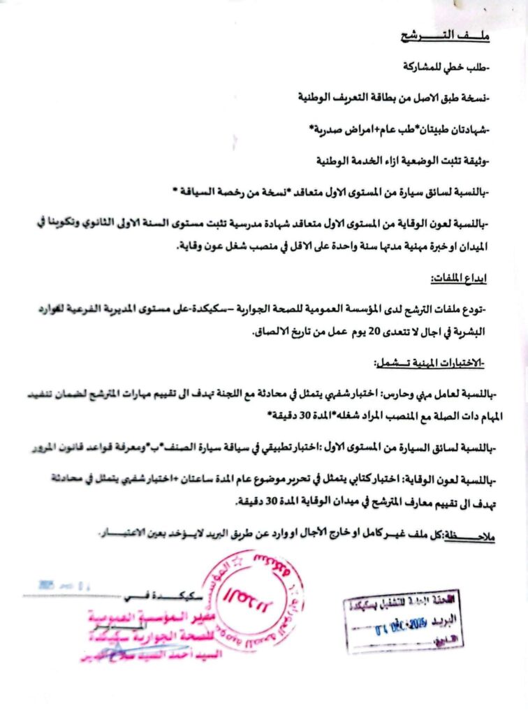 اعلان توظيف بالمؤسسة العمومية للصحة الجوارية سكيكدة