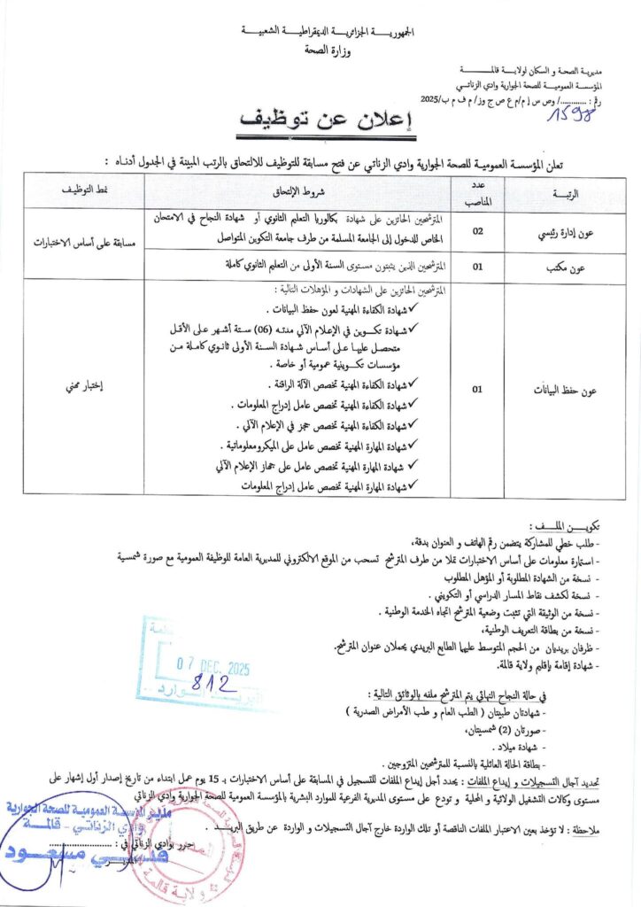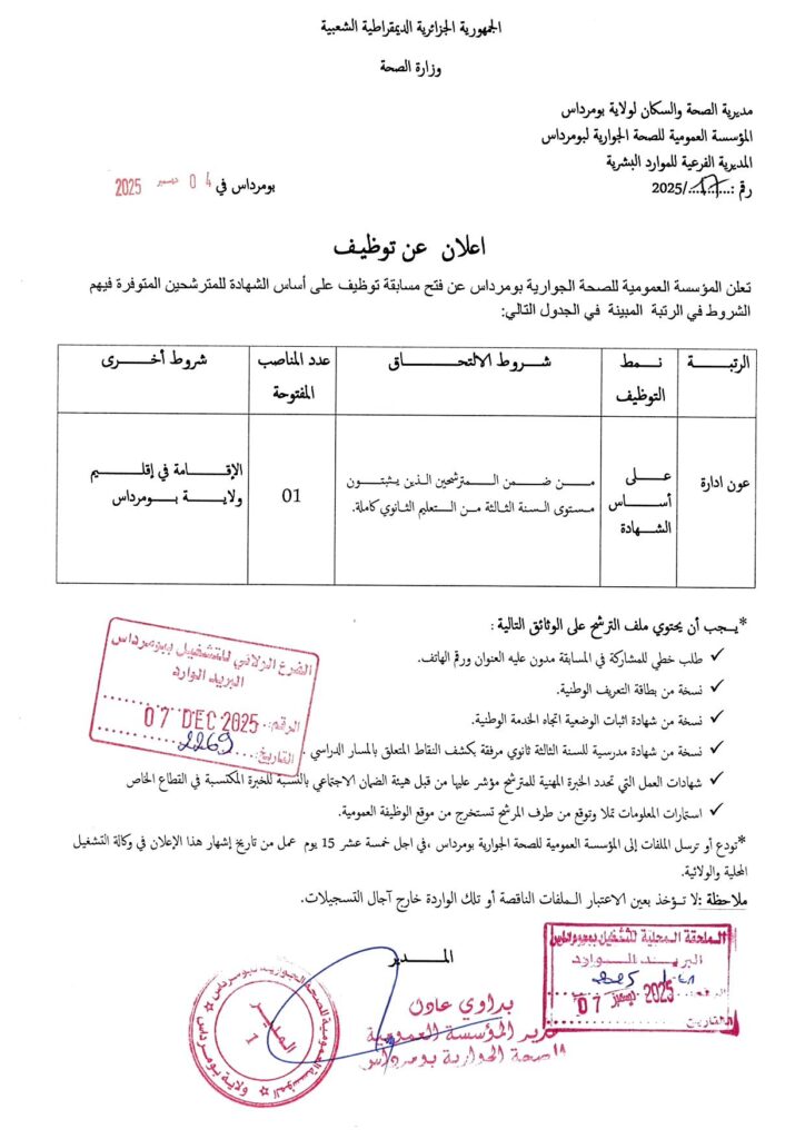 تعلن المؤسسة العمومية للصحة الجوارية ببومرداس عن فتح مسابقة توظيف على أساس الشهادة لسنة 2025 كما هو مبين أدناه: