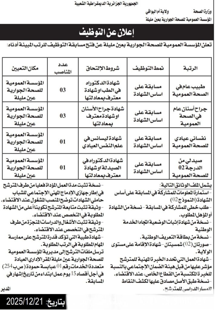تعلن المؤسسة العمومية للصحة الجوارية بعين مليلة عن فتح مسابقة توظيف للالتحاق بالرتب المبينة أدناه، وذلك وفق الشروط المحددة: