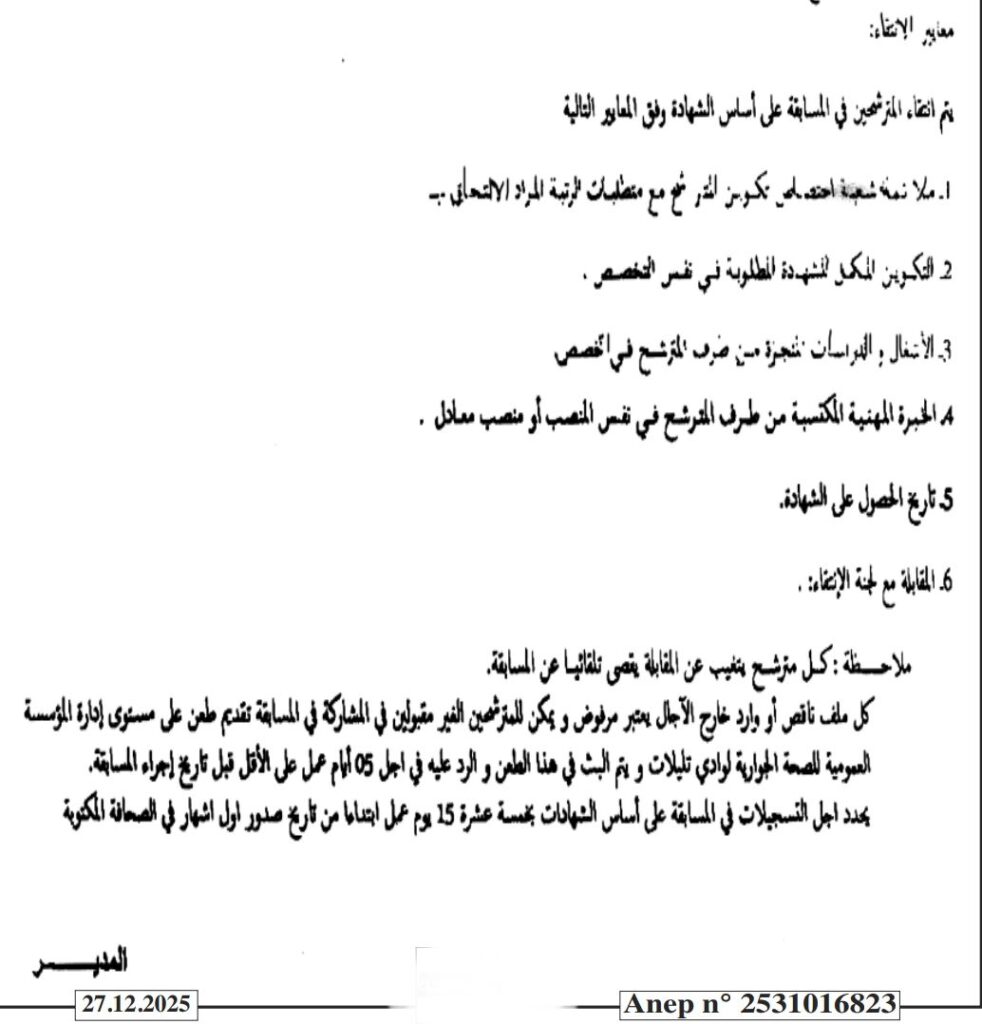 تعلن المؤسسة العمومية للصحة الجوارية لوادي تليلات عن فتح مسابقة للتوظيف عن طريق الشهادة لسنة 2025، في الرتب المبينة أدناه: