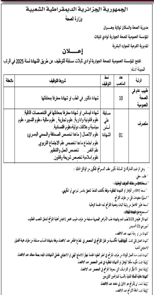 اعلان توظيف بالمؤسسة العمومية للصحة الجوارية لوادي تليلات بوهران