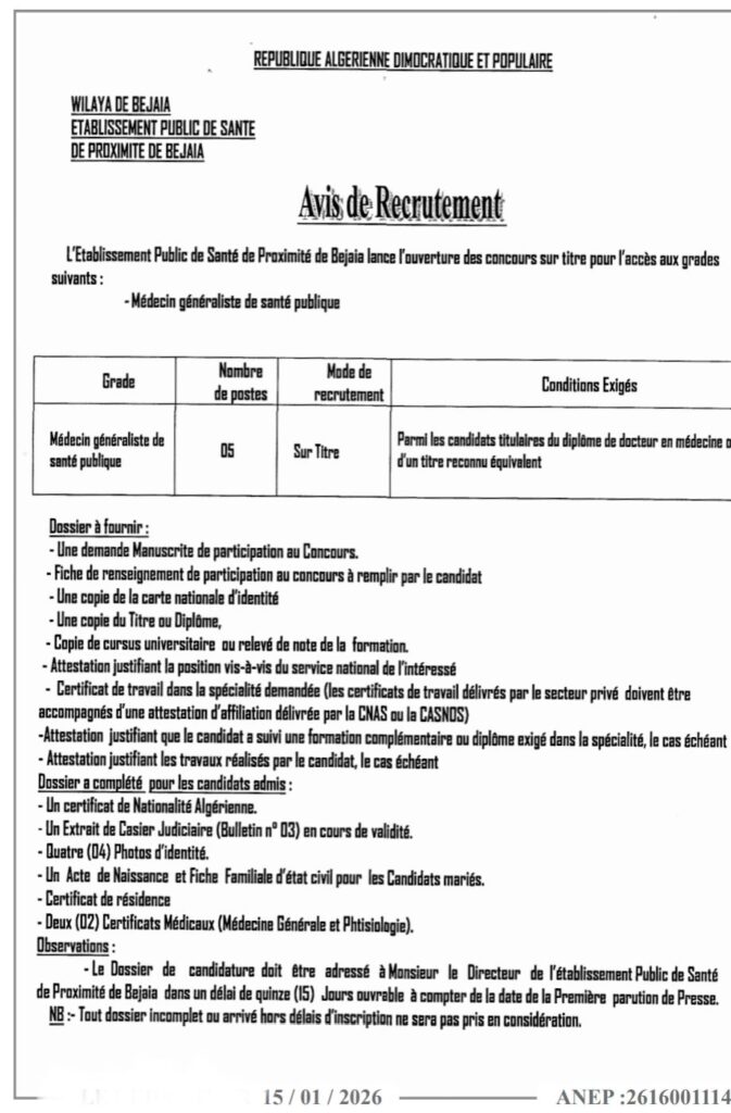اعلان توظيف بالمؤسسة العمومية للصحة الجوارية ببجاية