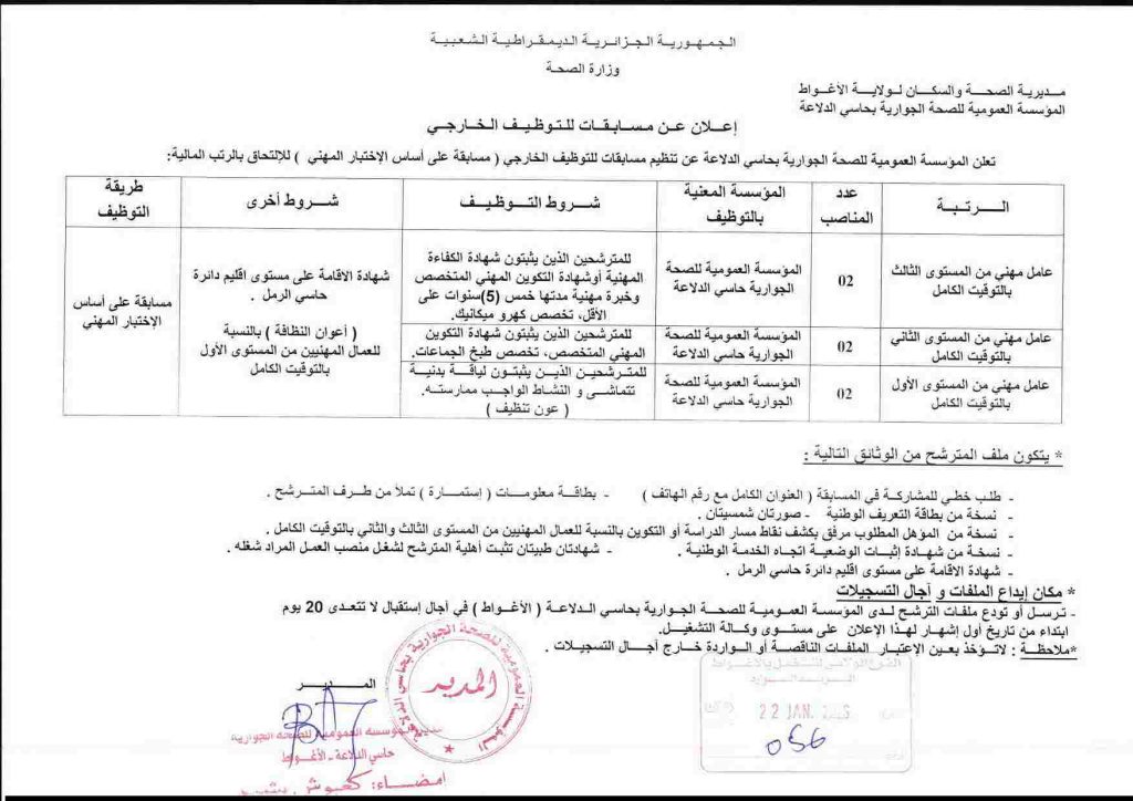 اعلان توظيف بالمؤسسة العمومية للصحة الجوارية بحاسي الدلاعة الاغواط