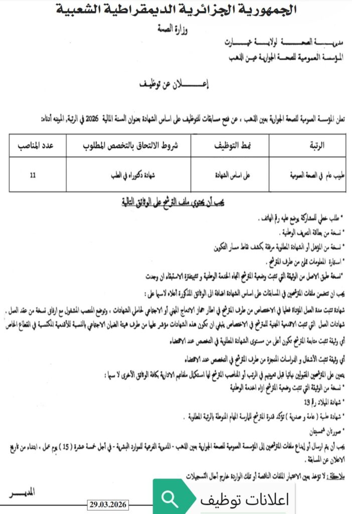 اعلان توظيف بالمؤسسة العمومية للصحة الجوارية بعين الذهب لولاية تيارت