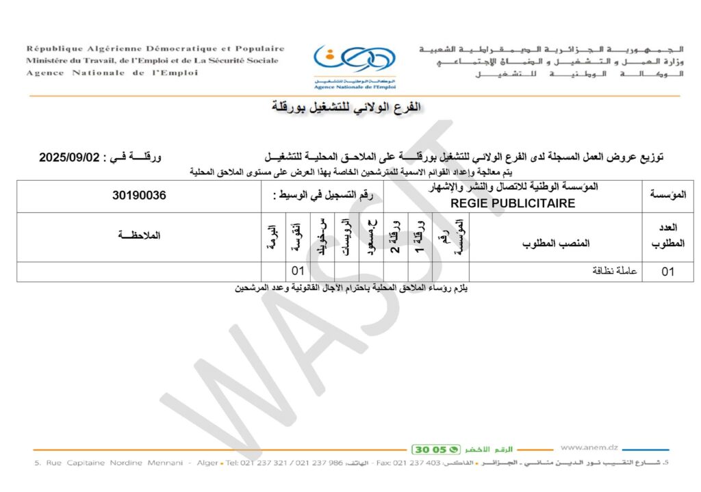 المؤسسة المستخدمة: المؤسسة الوطنية للاتصال والنشر والإشهار – REGIE PUBLICITAIRE