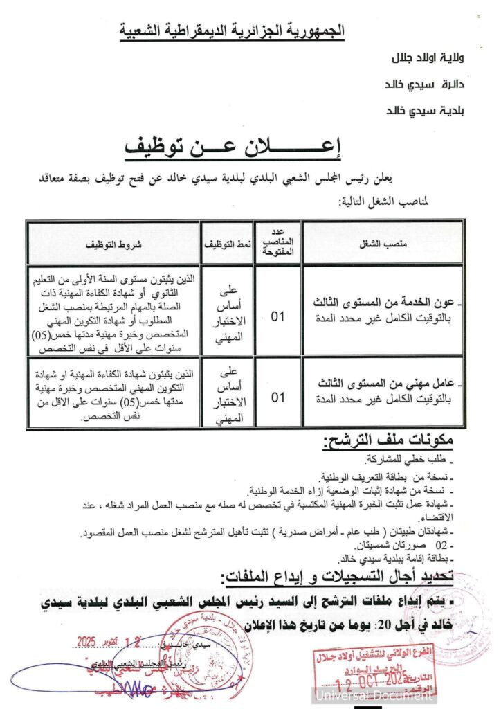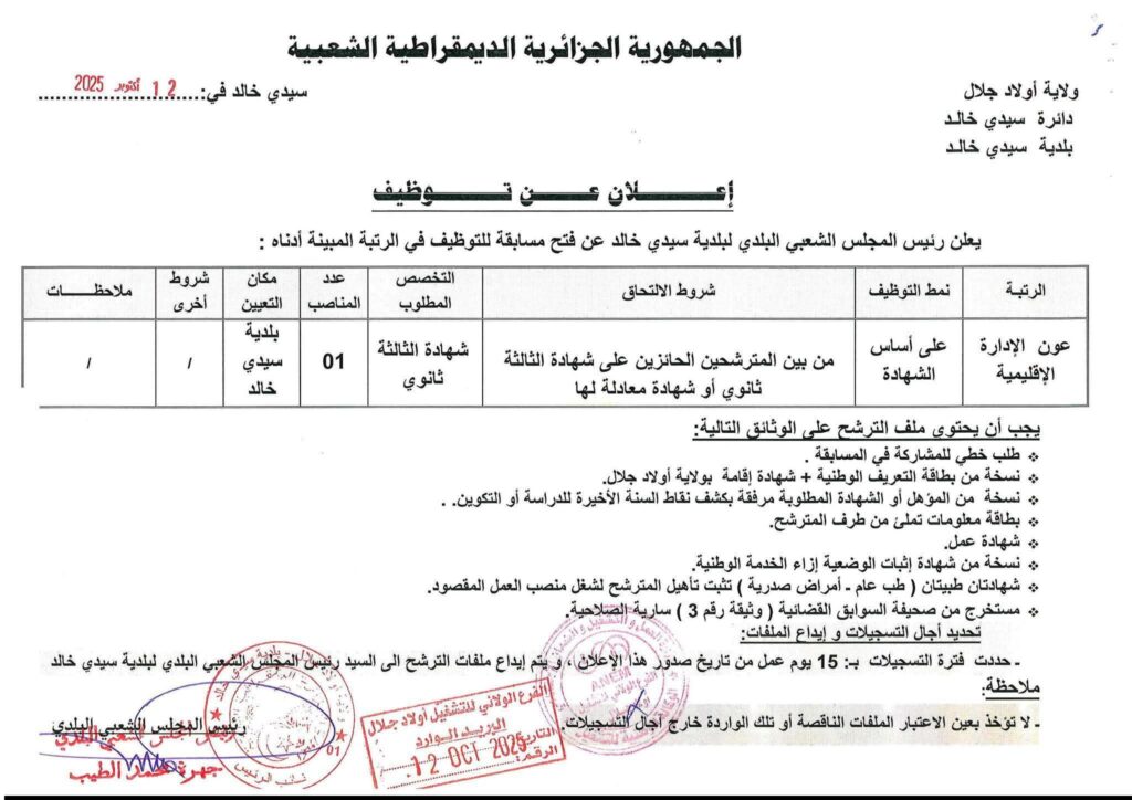 اعلان توظيف بالمجلس الشعبي البلدي لبلدية سيدي خالد ولاية أولاد الجلال