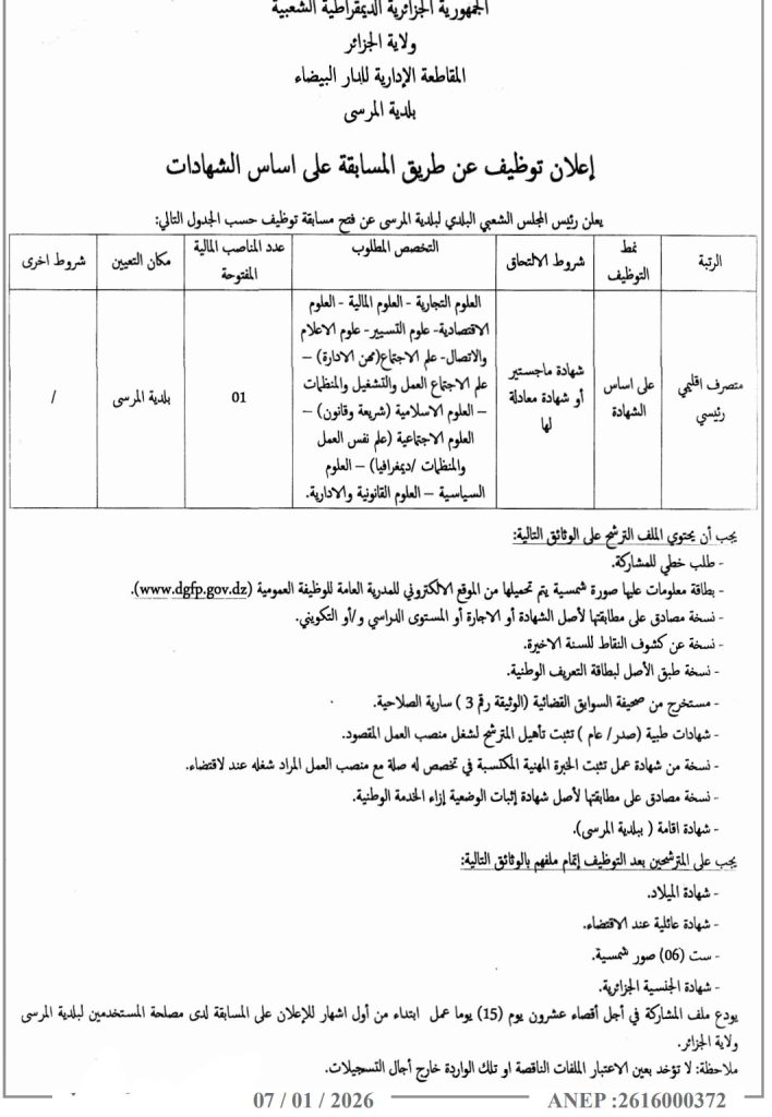 متصرف إقليمي رئيسي على أساس الشهادة شهادة ماجستير أو شهادة معادلة لها العلوم التجارية – العلوم المالية – العلوم الاقتصادية – علوم التسيير – علوم الإعلام والاتصال – علم الاجتماع (مهن الإدارة) – علم الاجتماع العمل والتشغيل والمنظمات – العلوم الإسلامية (شريعة وقانون) – العلوم الاجتماعية (علم نفس العمل والمنظمات / ديمغرافيا) – العلوم السياسية – العلوم القانونية والإدارية. 01 بلدية المرسى /