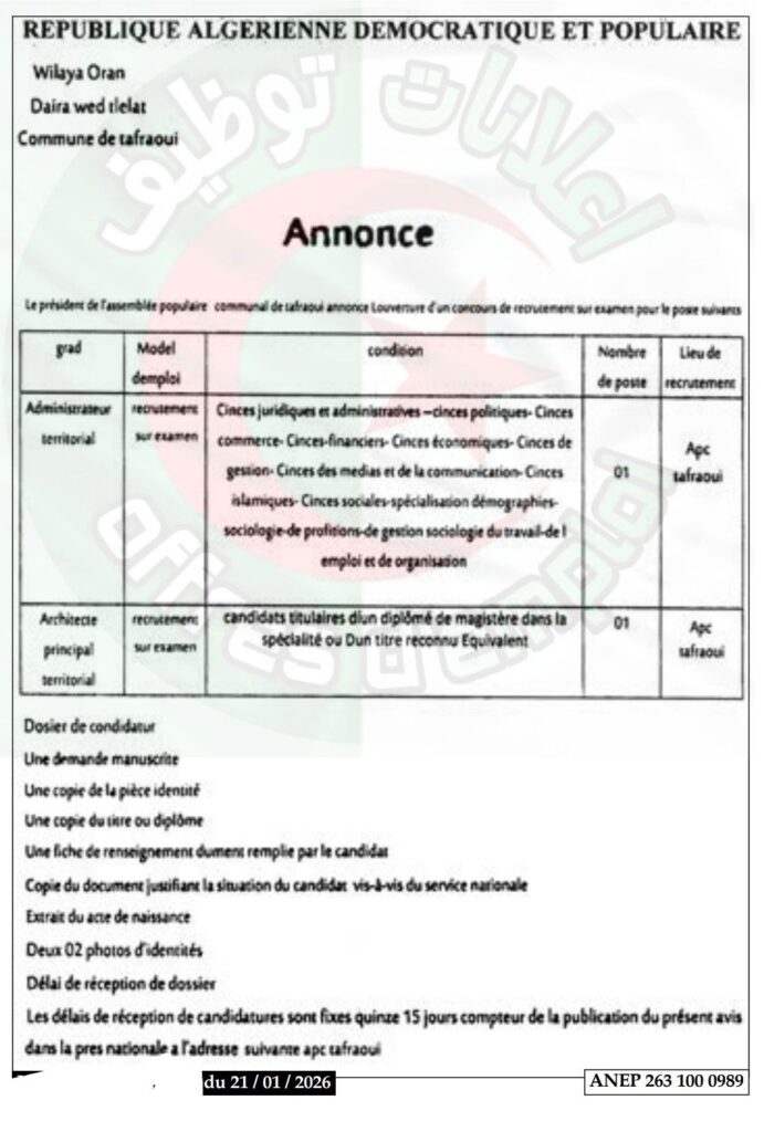 اعلان توظيف بالمجلس الشعبي البلدي لبلدية طفراوي وهران
