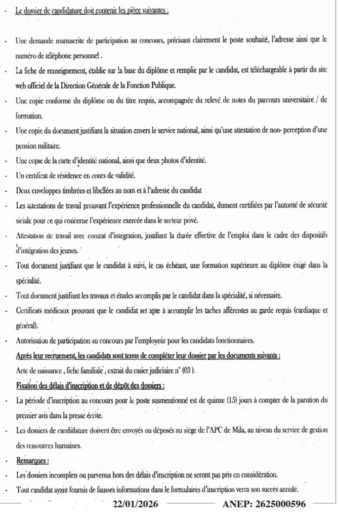 يعلن رئيس المجلس الشعبي البلدي لبلدية ميلة عن فتح مسابقة توظيف للالتحاق بالمنصب التالي: