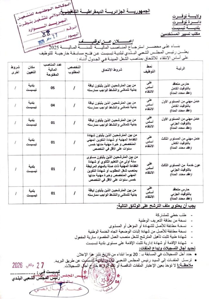 اعلان توظيف بالمجلس الشعبي البلدي لبلدية تبسبست ولاية توقرت