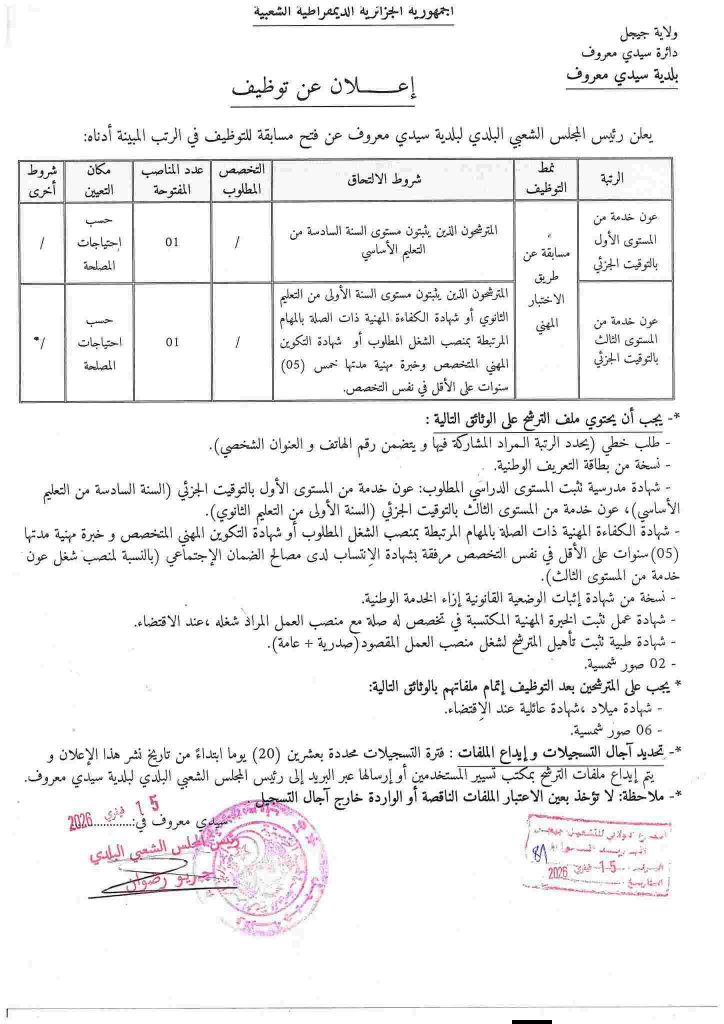 اعلان توظيف بالمجلس الشعبي البلدي لبلدية سيدي معروف ولاية جيجل