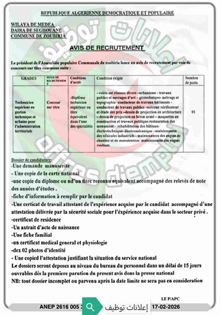 اعلان توظيف بالمجلس الشعبي البلدي لبلدية الزبيرية ولاية المدية