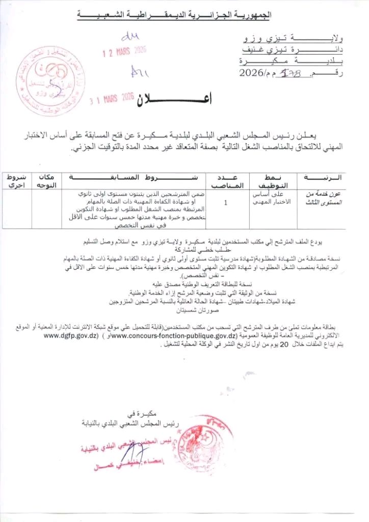 اعلان توظيف بالمجلس الشعبي البلدي لبلدية مكيرة تيزي وزو