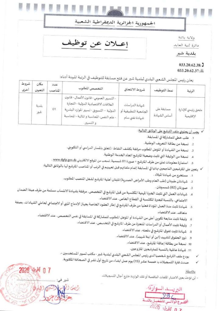 اعلان توظيف بالمجلس الشعبي البلدي لبلدية شير ولاية باتنة