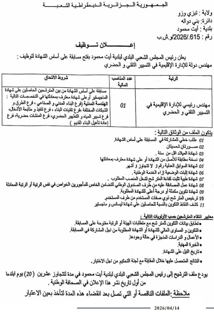 اعلان توظيف بالمجلس الشعبي البلدي لبلدية أيت محمود تيزي وزو