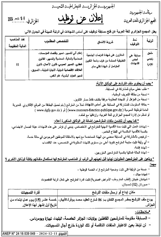 يعلن المجمع الجزائري للغة العربية عن فتح مسابقة للتوظيف على أساس الشهادات للالتحاق بالرتبة التالية: