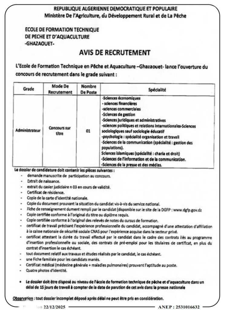 اعلان توظيف بالمدرسة التقنية للتكوين في الصيد البحري وتربية المائيات غزوات تلمسان
