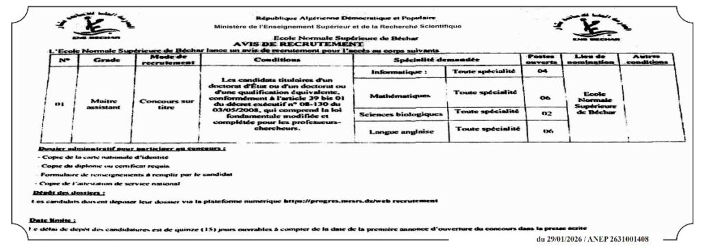 تعلن المدرسة العليا للأساتذة ببشار عن فتح مسابقة توظيف للالتحاق بسلك الأساتذة الباحثين في الرتبة التالية: