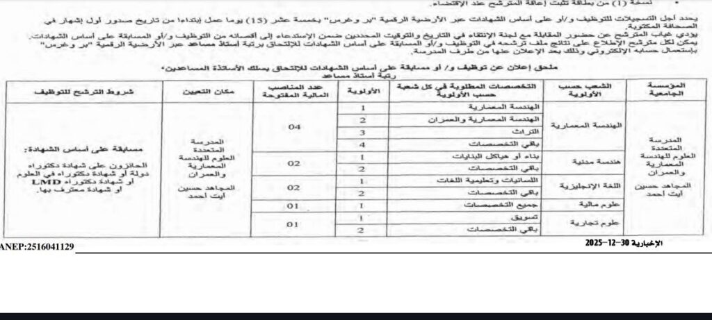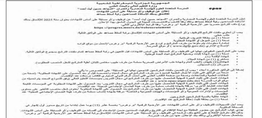 تعلن المدرسة المتعددة العلوم للهندسة المعمارية والعمران «المجاهد حسين آيت أحمد» عن فتح توظيف و/أو مسابقة على أساس الشهادات بعنوان سنة 2025، للإلتحاق بسلك الأساتذة المساعدين رتبة أستاذ مساعد، وذلك وفق الشعب والتخصصات المبينة في الجدول الملحق بهذا الإعلان.