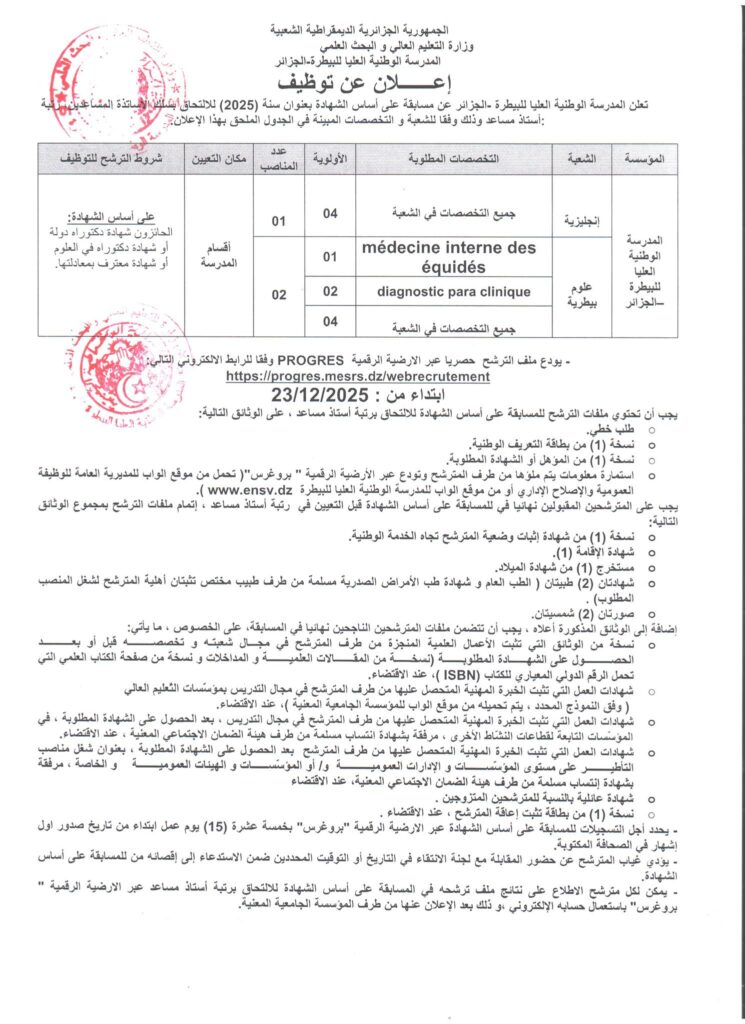 تعلن المدرسة الوطنية العليا للبيطرة – الجزائر عن فتح مسابقة على أساس الشهادة بعنوان سنة 2025 للالتحاق بسلك الأساتذة المساعدين، رتبة: أستاذ مساعد، وذلك وفقًا للشُّعب والتخصصات المبينة في الجدول الملحق بهذا الإعلان.