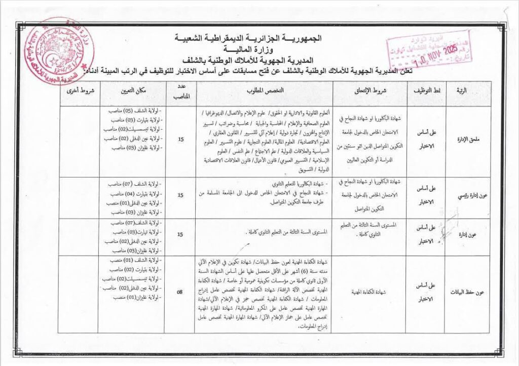 تعلن المديرية الجهوية للأملاك الوطنية بالشلف عن فتح مسابقات توظيف على أساس الاختبار للالتحاق بالرتب المبينة أدناه: