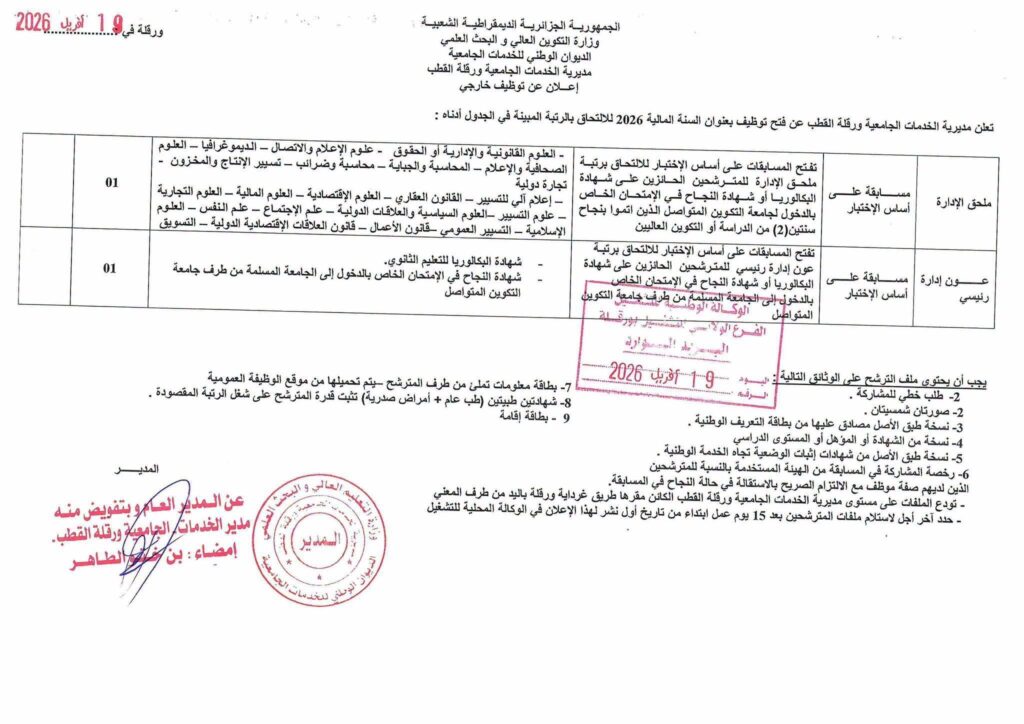 تعلن مديرية الخدمات الجامعية ورقلة القطب عن فتح توظيف بعنوان السنة المالية 2026 للالتحاق بالرتب المبينة في الجدول أدناه: