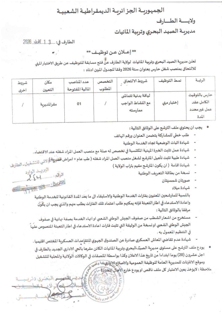 تعلن مديرية الصيد البحري وتربية المائيات لولاية الطارف عن فتح مسابقة للتوظيف عن طريق الاختبار المهني للالتحاق بمنصب شغل حارس بعنوان سنة 2026 وفقا للجدول المبين أدناه: