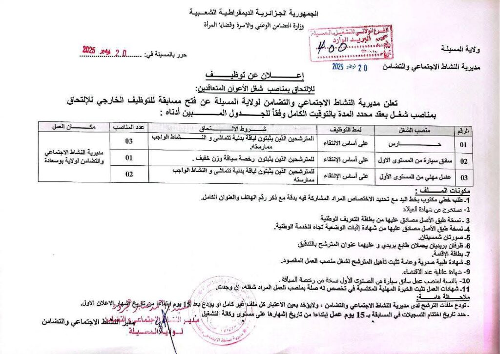 اعلان توظيف بالمديرية النشاط الاجتماعي والتضامن لولاية المسيلة