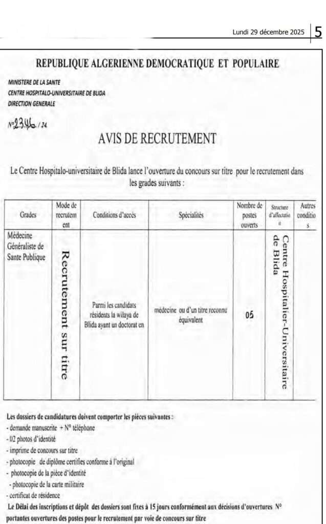 يعلن المركز الاستشفائي الجامعي لولاية البليدة عن فتح مسابقة توظيف على أساس الشهادة، وذلك لشغل المناصب المبينة أدناه: