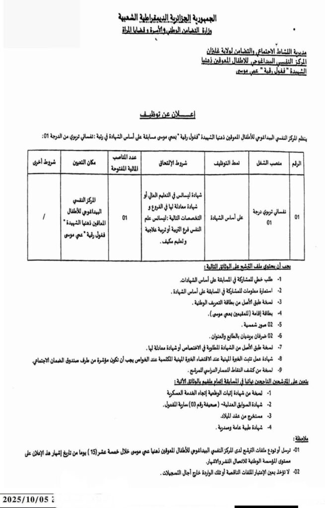 اعلان توظيف بالمركز النفسي البيداغوجي للأطفال المعوقين ذهنيا غليزان