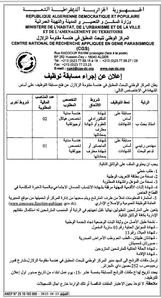 يعلن المركز الوطني للبحث المطبق في هندسة مقاومة الزلازل (CGS) عن فتح مسابقة توظيف على أساس الشهادة في التخصصات التالية: