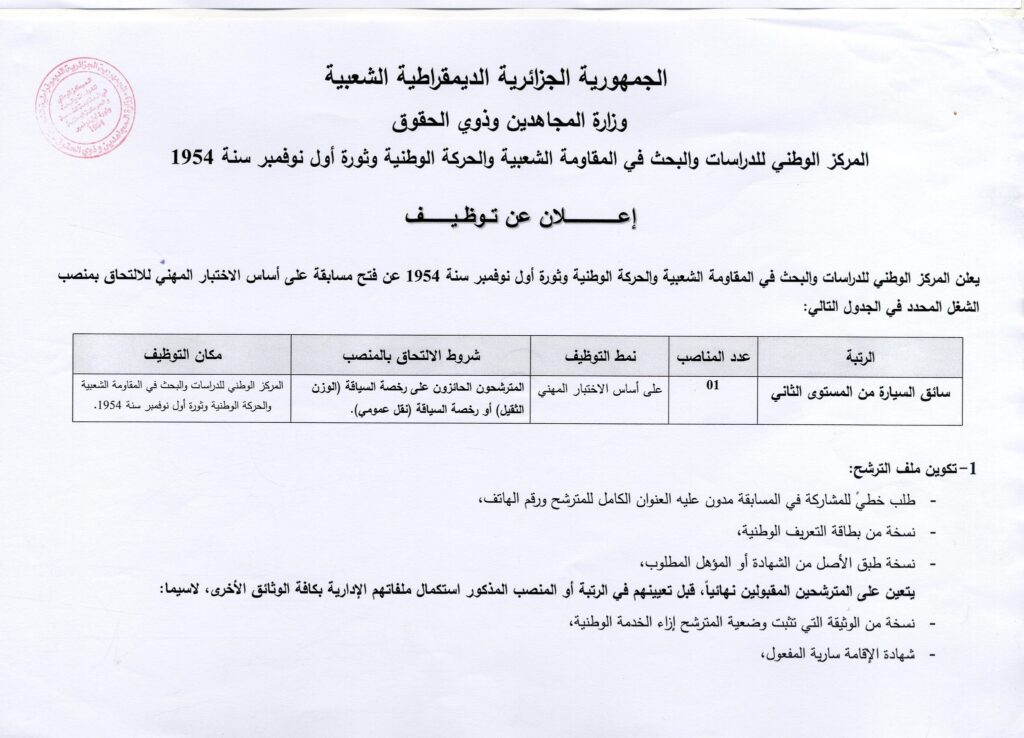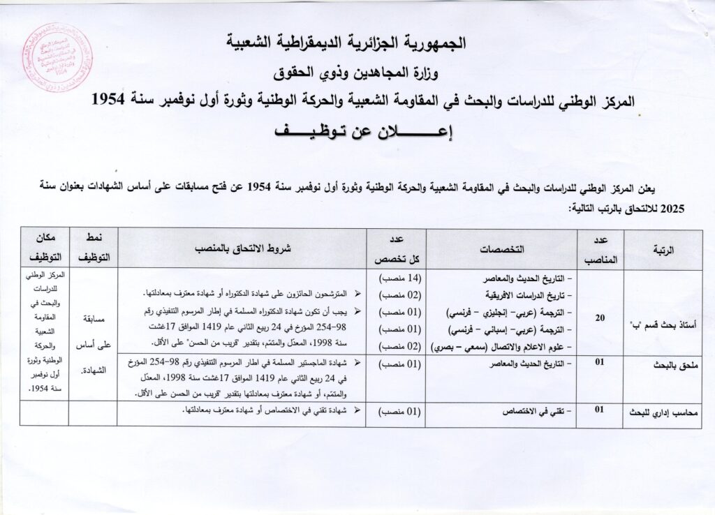 اعلان توظيف بالمركز الوطني للدراسات والبحث في المقاومة الشعبية والحركة الوطنية وثورة أول نوفمبر سنة 1954