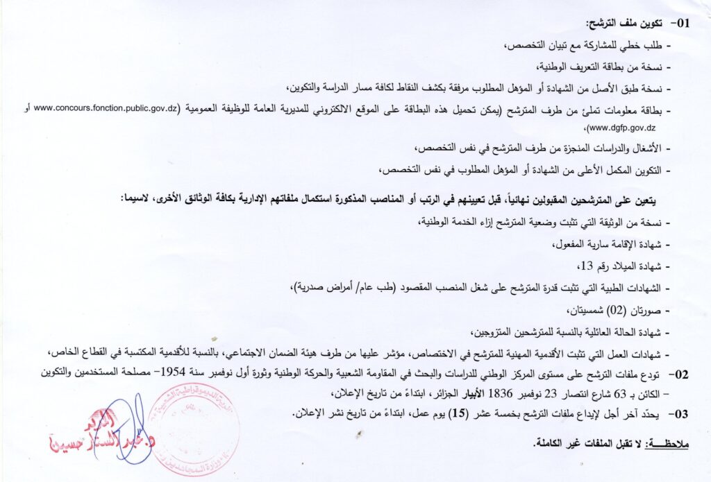 • يحدد آخر أجل لإيداع الملفات بـ عشرين (20) يوم عمل ابتداءً من تاريخ نشر الإعلان