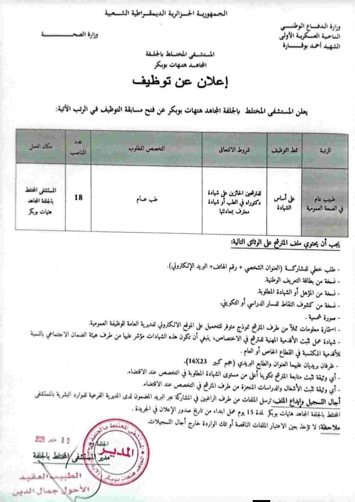 اعلان توظيف بالمستشفى المختلط بالجلفة المجاهد هتهات بوبكر…الناحية العسكرية الأولى