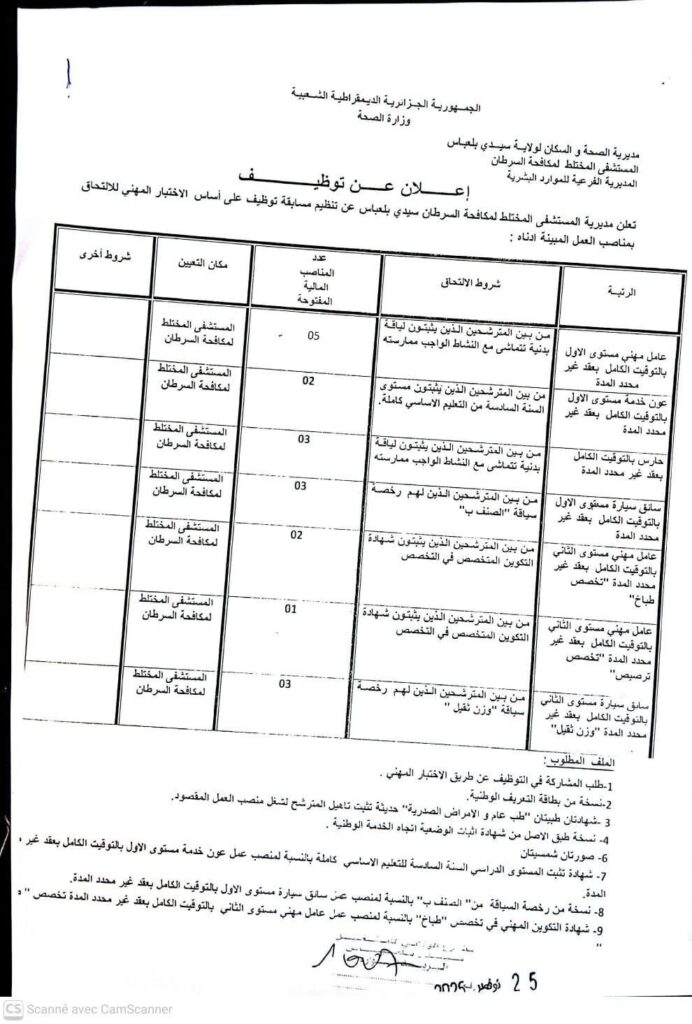 تعلن إدارة المستشفى المختلط لمكافحة السرطان – سيدي بلعباس عن تنظيم مسابقة توظيف على أساس الاختبار المهني للالتحاق بمناصب العمل المبينة أدناه: