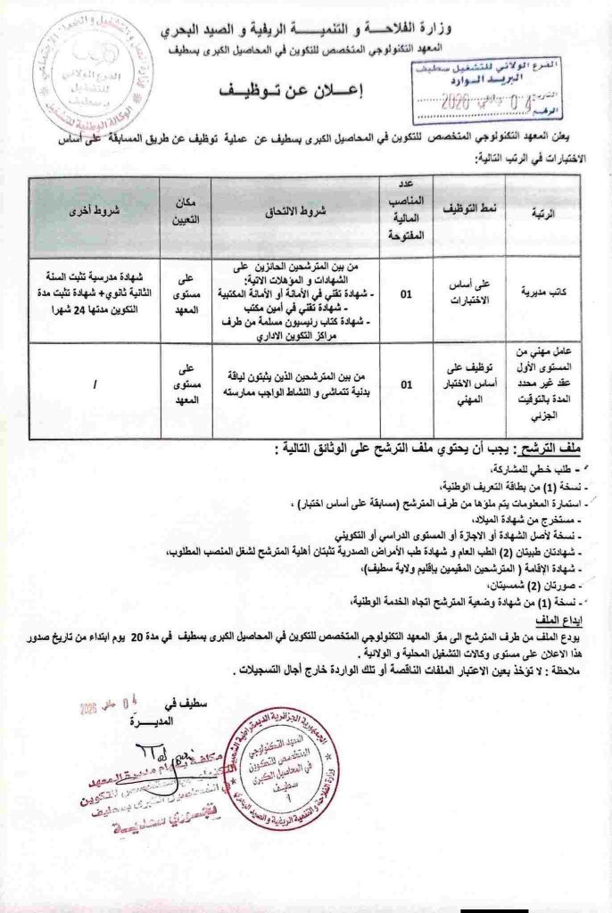 يعلن المعهد التكنولوجي المتخصص للتكوين في المحاصيل الكبرى بسطيف عن عملية توظيف عن طريق المسابقة على أساس الاختبارات في الرتب التالية: