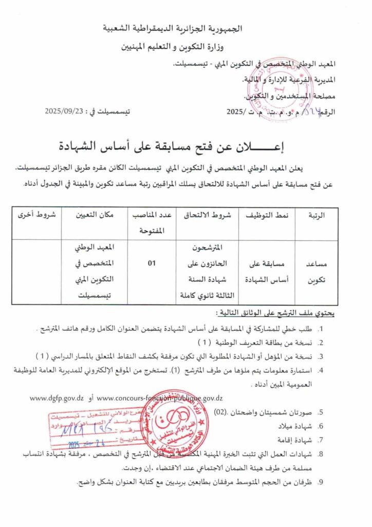 مساعد تكوين مسابقة على أساس الشهادة شهادة السنة الثالثة ثانوي كاملة 01 المعهد الوطني المتخصص في التكوين المهني – تيسمسيلت