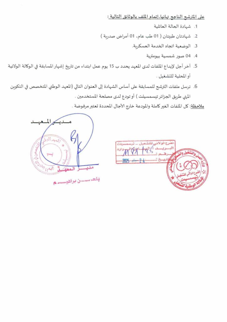 • تودع أو ترسل الملفات إلى:المعهد الوطني المتخصص في التكوين المهني – طريق الجزائر – تيسمسيلت (مصلحة المستخدمين).