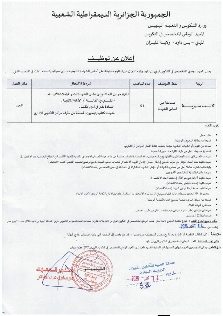 يعلن المعهد الوطني المتخصص في التكوين المهني بن داود – ولاية غليزان عن تنظيم مسابقة على أساس الشهادة للتوظيف لسنة 2025 في المنصب التالي: