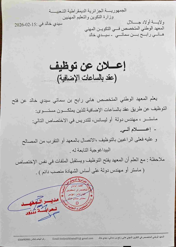 يعلم المعهد الوطني المتخصص هاني رابح بن سماتي سيدي خالد عن فتح التوظيف عن طريق عقد بالساعات الإضافية للذين يملكون مستوى: