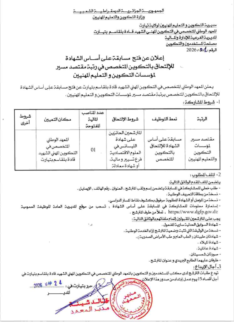 يعلن المعهد الوطني المتخصص في التكوين المهني الشهيد قادة بلقاسم بتيارت عن فتح مسابقة على أساس الشهادة للإلتحاق بالتكوين المتخصص برتبة مقتصد مسير لمؤسسات التكوين والتعليم المهنيين.