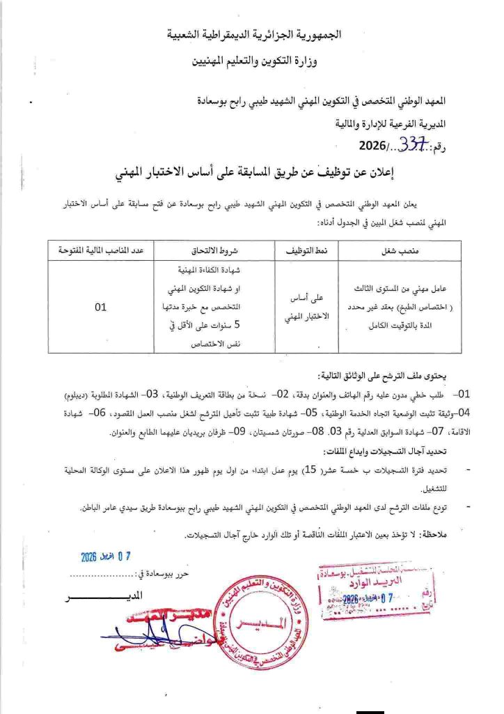 اعلان توظيف بالمعهد الوطني المتخصص في التكوين المهني الشهيد طيبي رابح بوسعادة