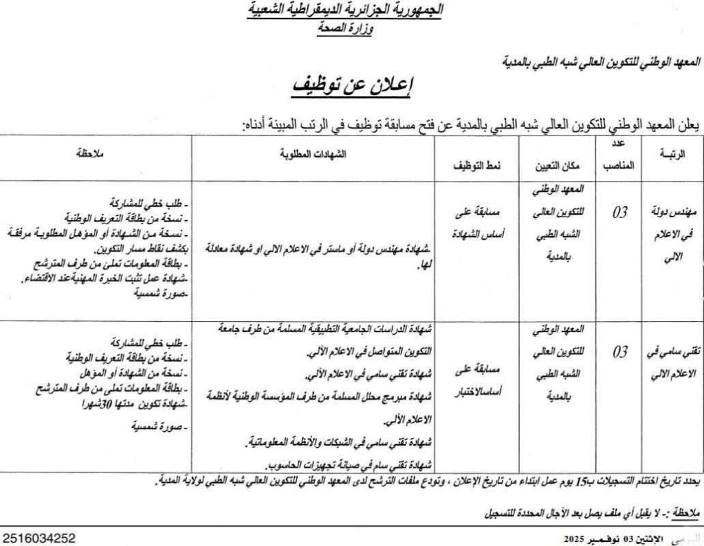يُعلن المعهد الوطني للتكوين العالي شبه الطبي بولاية المدية عن فتح مسابقة توظيف على أساس الشهادة في الرتب المبينة أدناه: